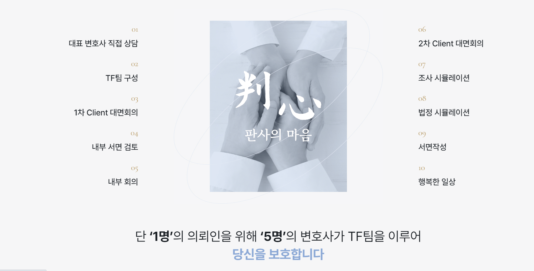 판심 법무법인은 단 ‘1명의 의뢰인’을 위해 ‘5명의 변호사’가 TF팀을 구성하여 철저히 대비합니다.